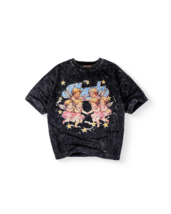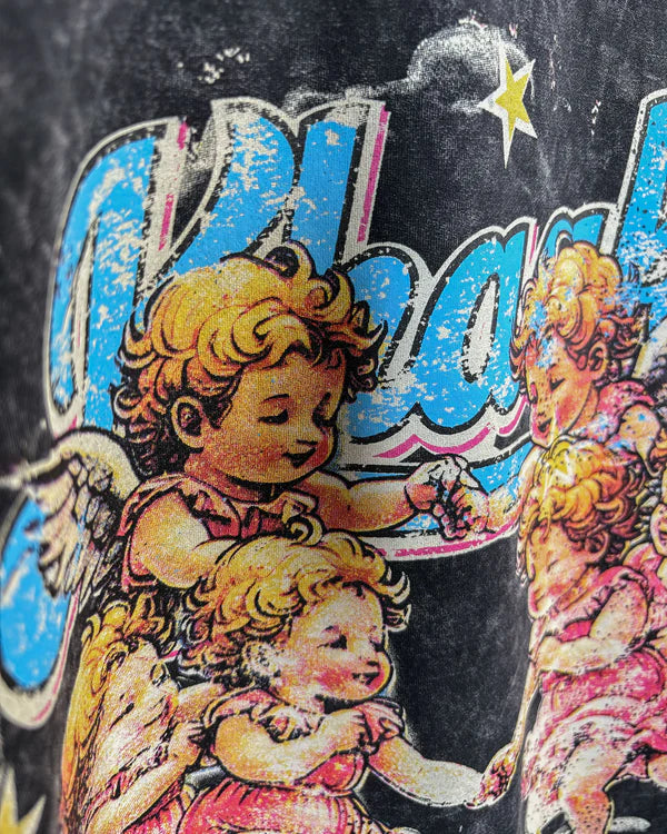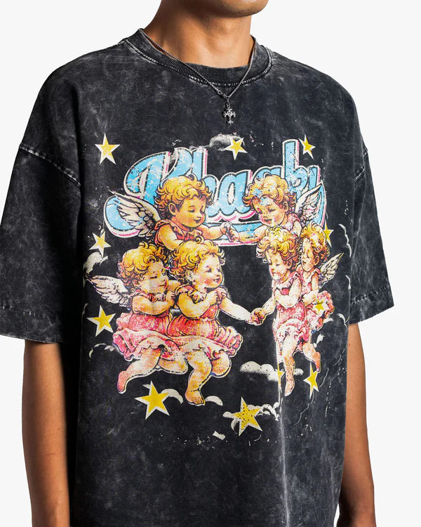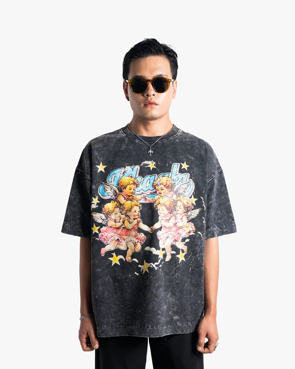 Crafted from 250 GSM Cotton Spandex Terry, the Angels oversized t-shirt delivers premium comfort with a relaxed streetwear fit. Featuring a stone washed effect for a naturally faded, vintage look, this piece showcases a dreamy retro cherub angel graphic that brings together old-school charm and modern streetwear aesthetics.