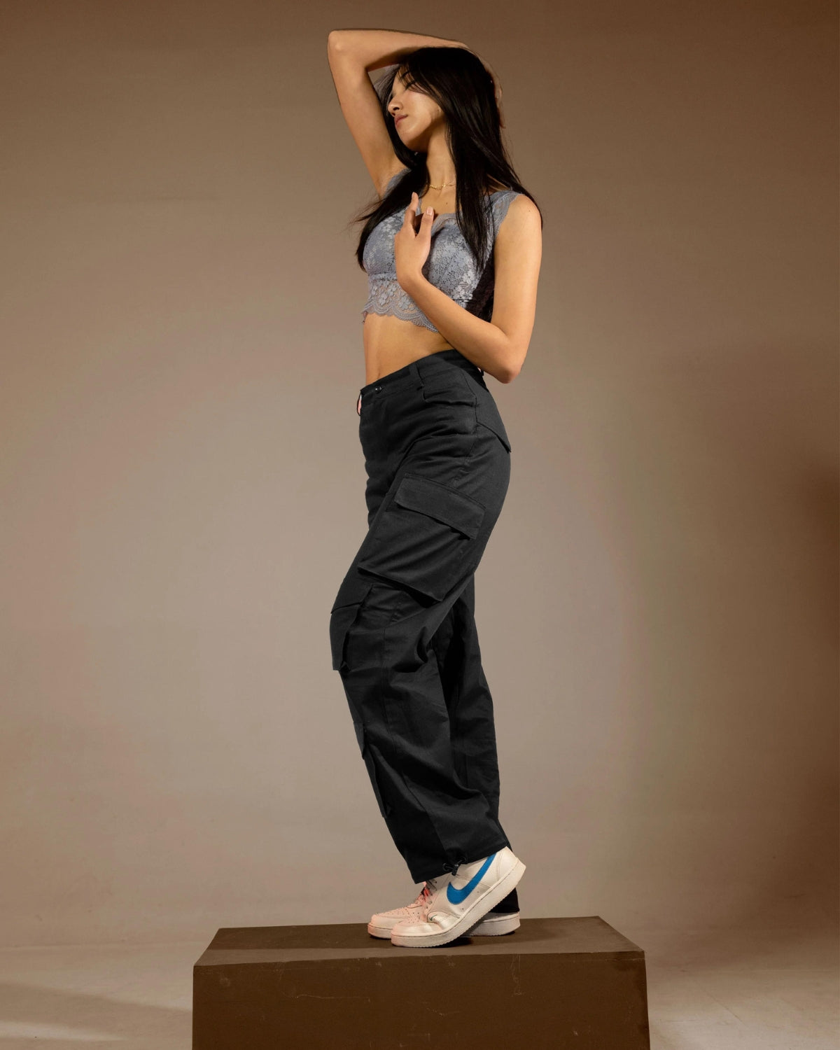 Unisex cargo in a sleek black color, This cargo stands out with its unique feature—a hidden pocket at back with a distinct V-shaped flat overlay, adding a touch of modernity to its design. But that’s not all! This cargo takes versatility to the next level with stretchable strings attached, allowing you to effortlessly convert it into joggers.