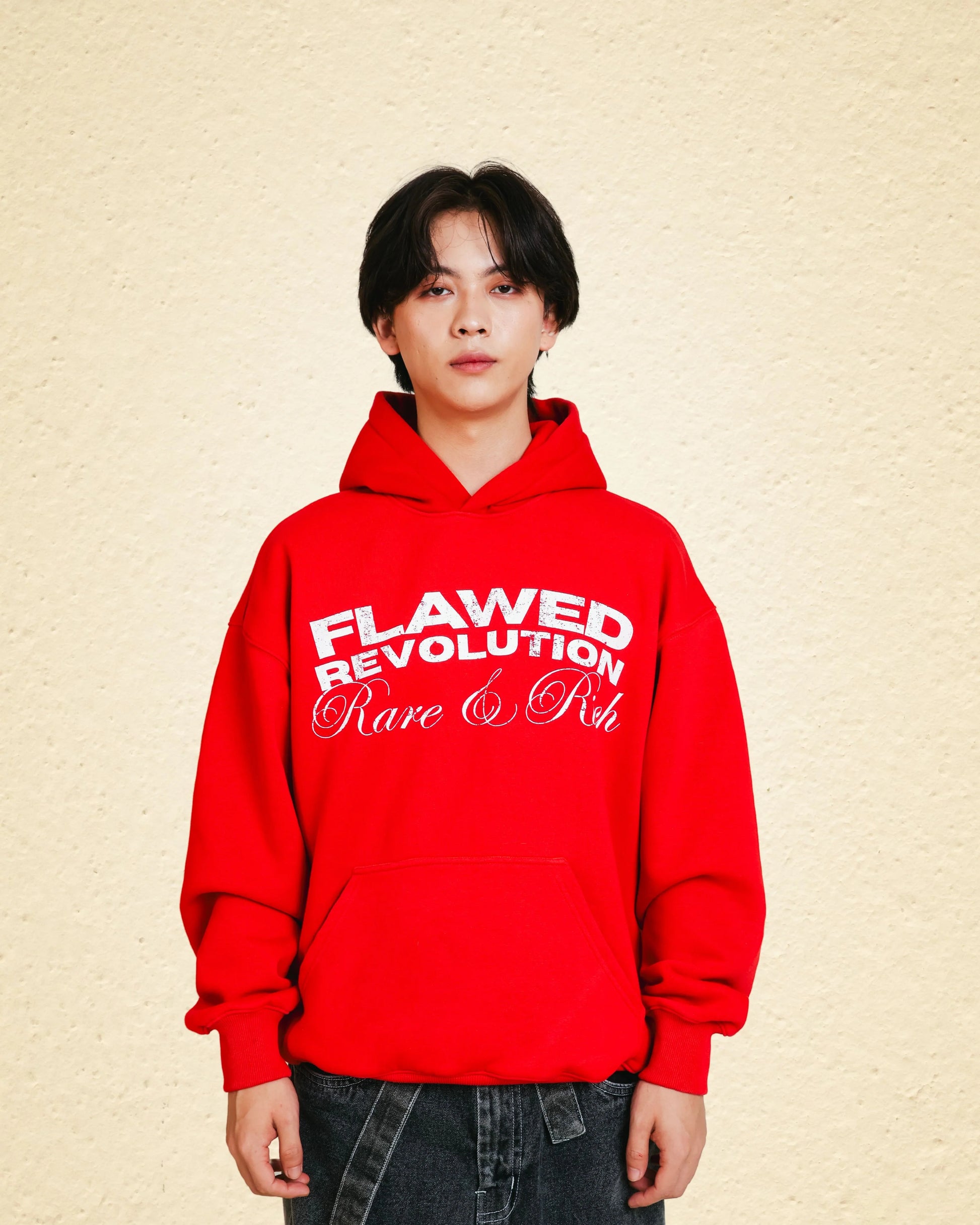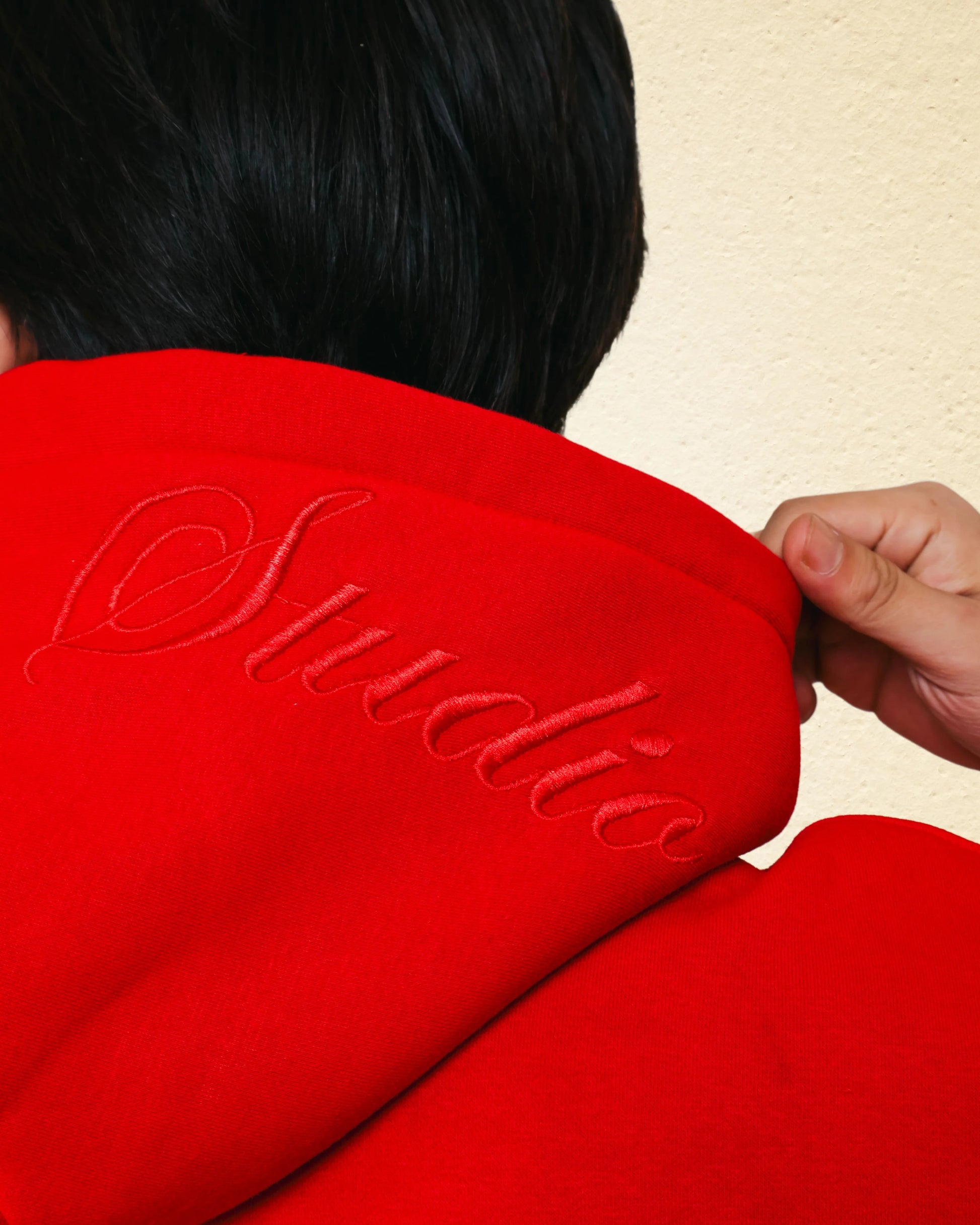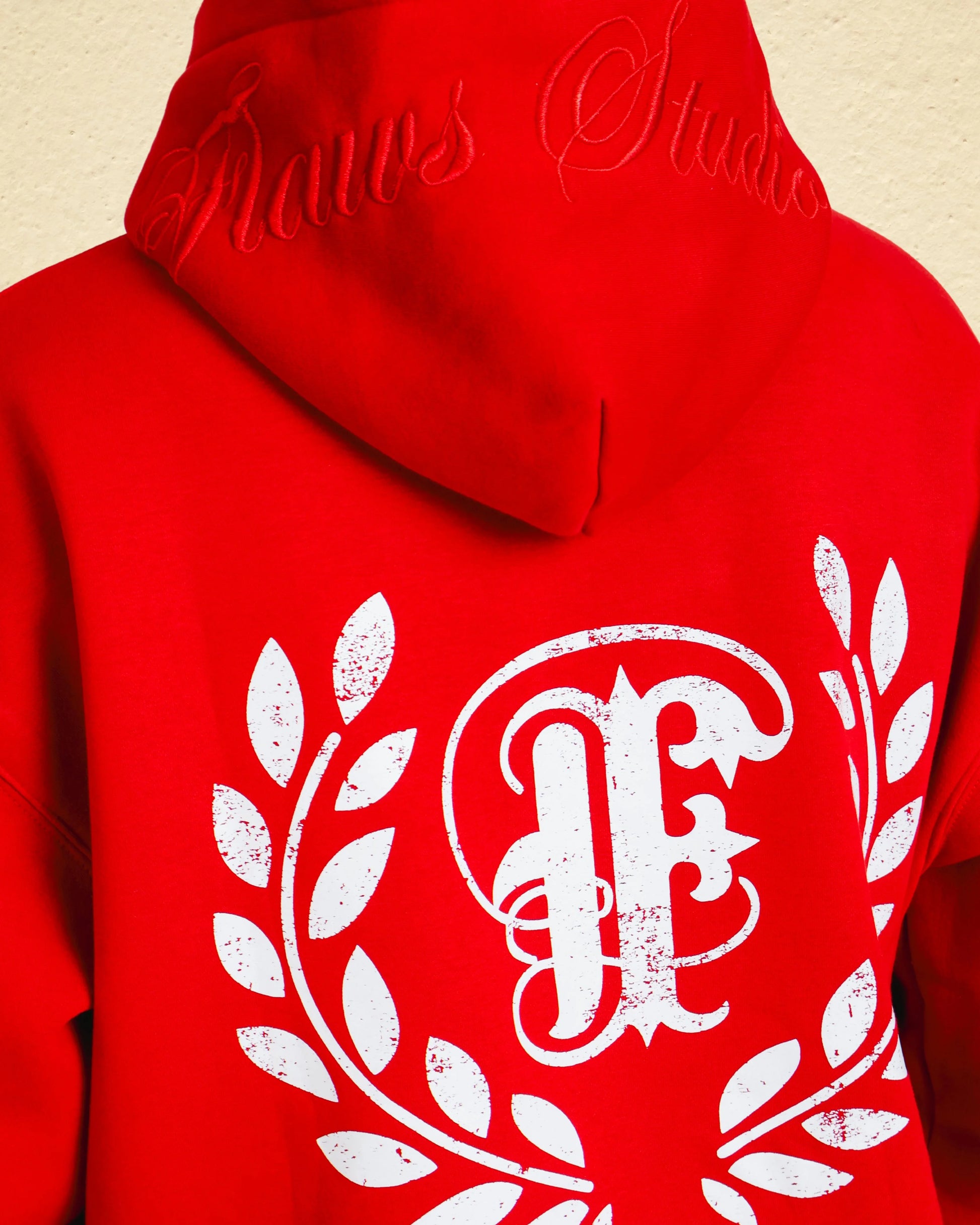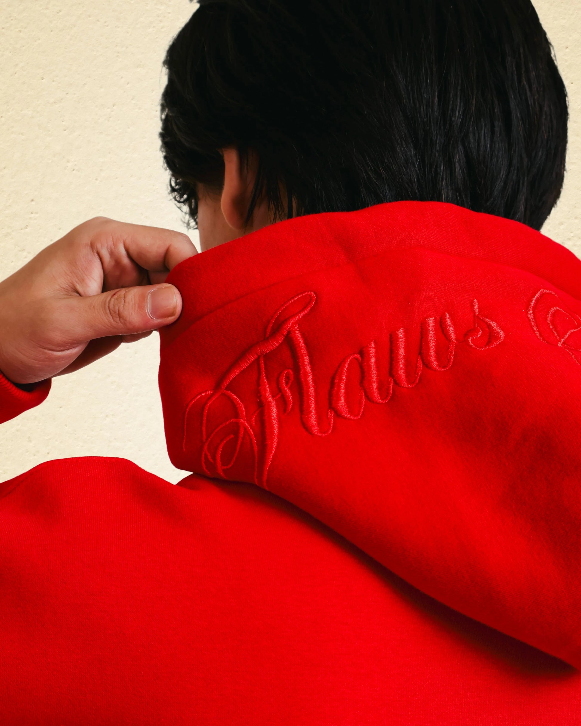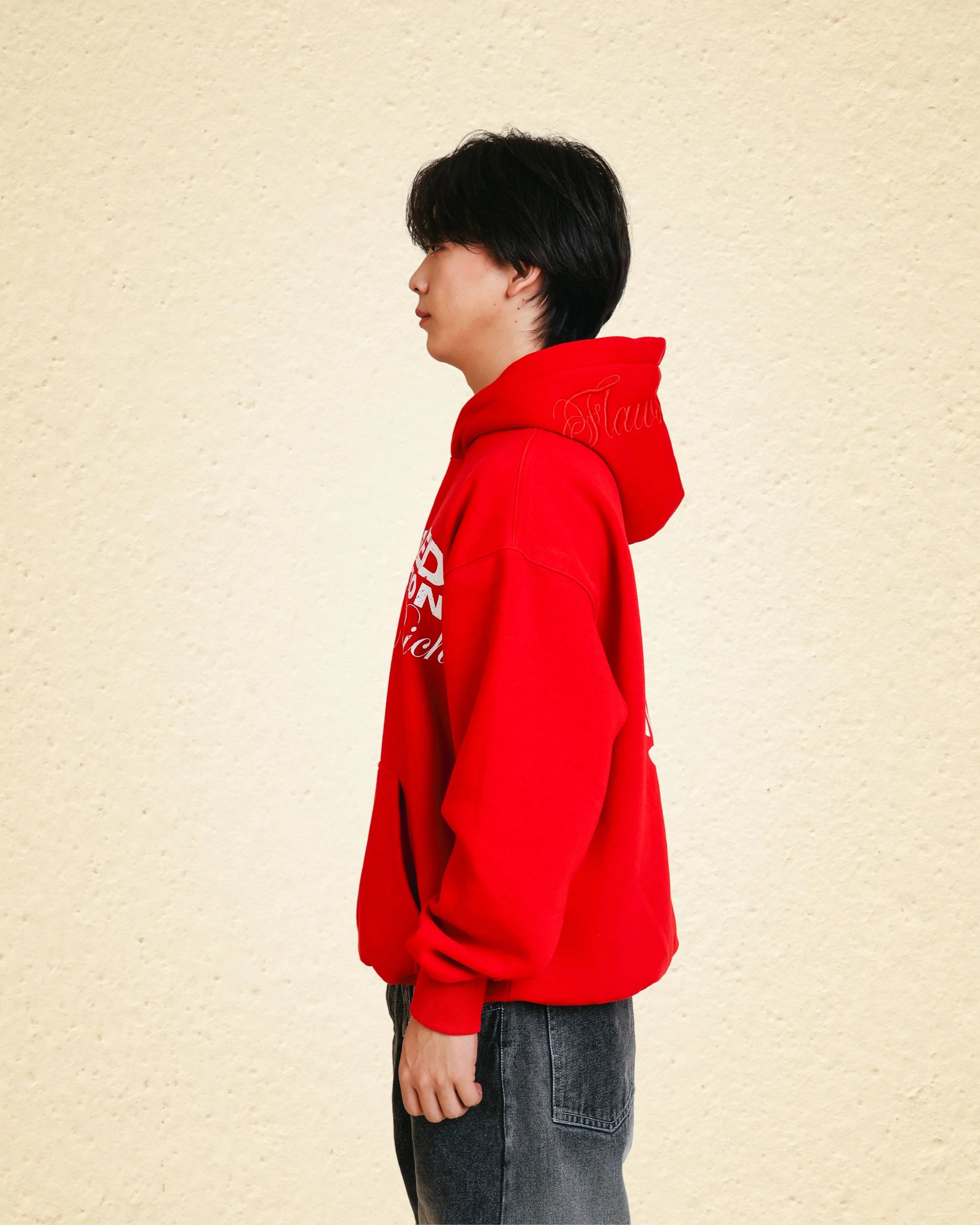 This red stonewashed hoodie adds a rugged edge to any outfit, while the front and hood embroidery gives it a touch of luxury.