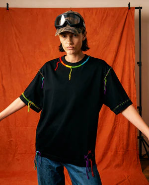 What makes the Concepteur T-shirt extraordinary is its celebration of the making process. Traditional seams and edges are transformed into design features through rainbow-gradient hand embroidery. From the neckline to the sleeves, hem to side seams—every structural element becomes a canvas for colorful artistry.