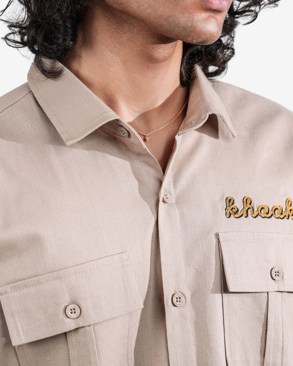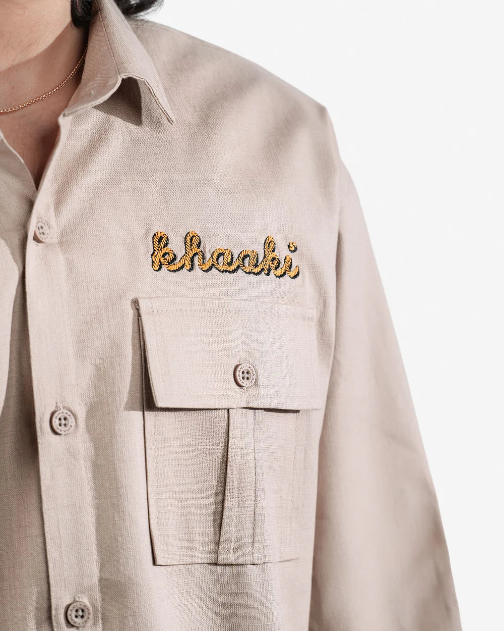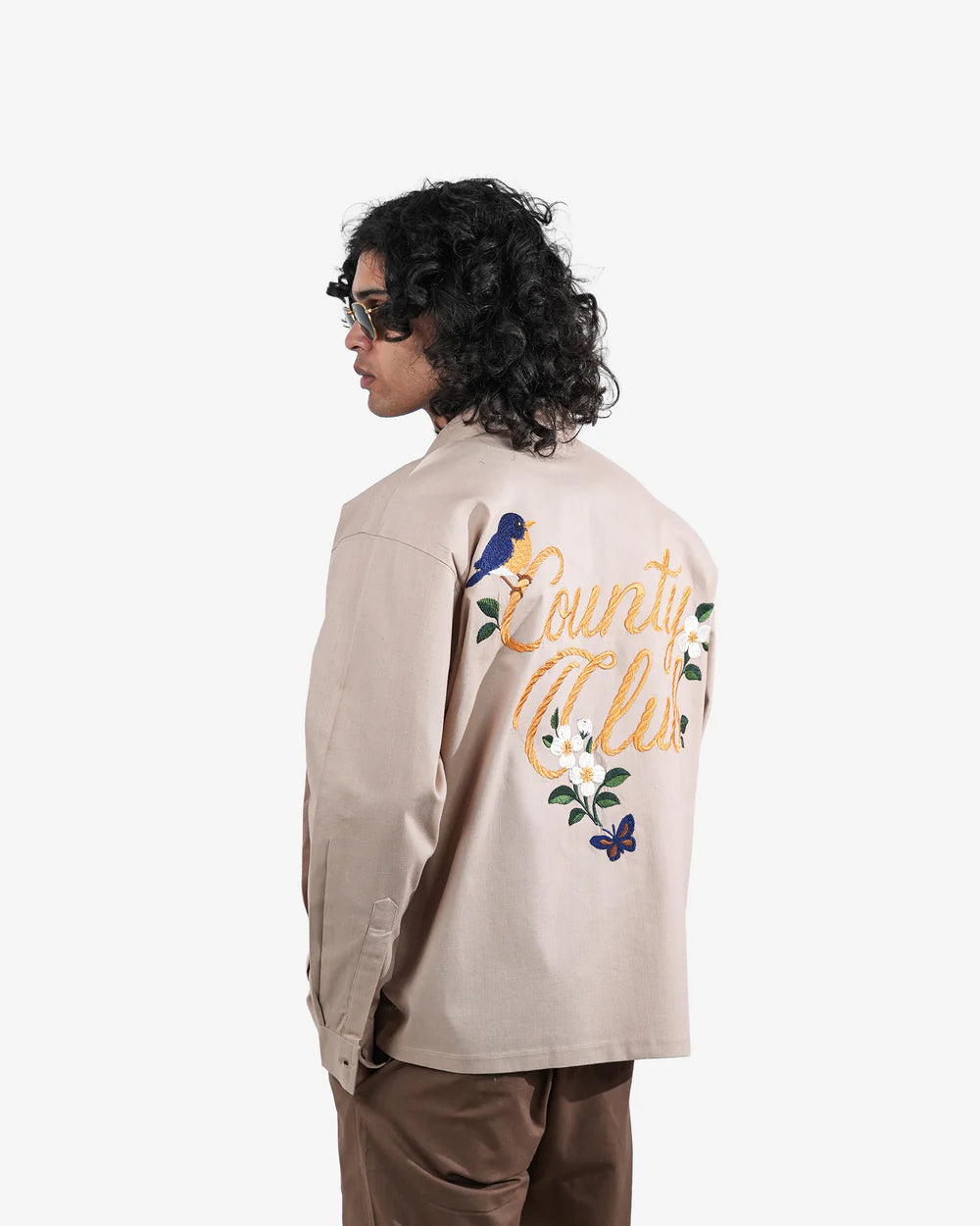 The County Club is a relaxed beige linen piece. It features double flap chest pockets with embroidered branding and intricate 3 lakh-stitch embroidery depicting bluebirds, boots, and delicate blooms. With its oversized silhouette and refined detailing, it adds a polished statement to everyday dressing.