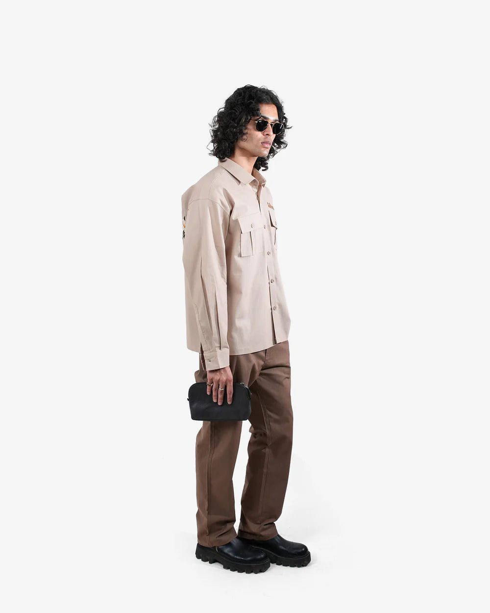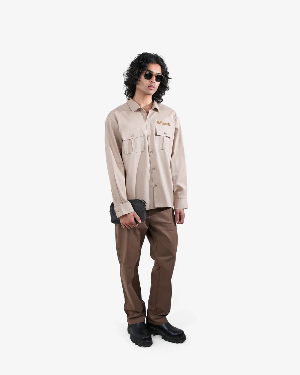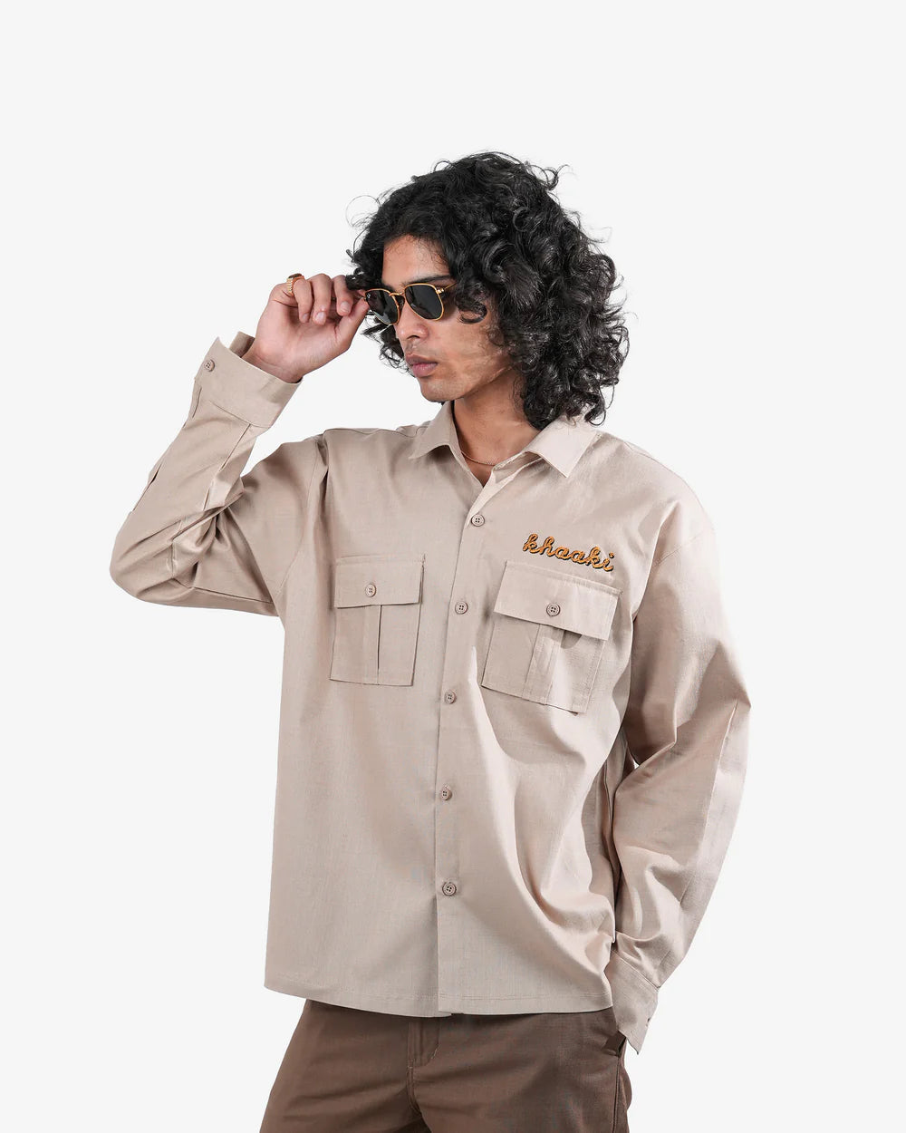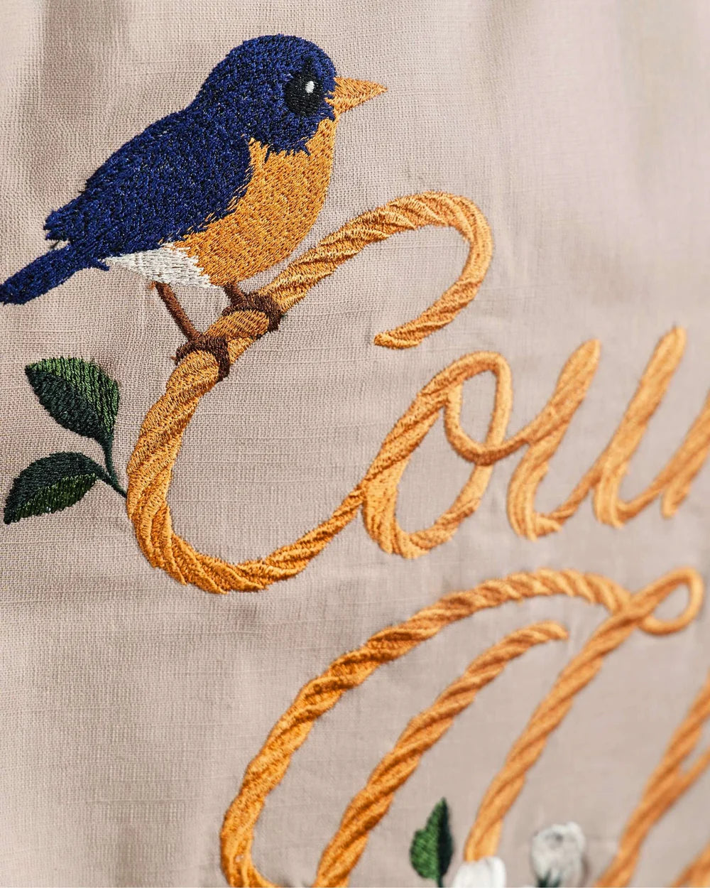The County Club is a relaxed beige linen piece. It features double flap chest pockets with embroidered branding and intricate 3 lakh-stitch embroidery depicting bluebirds, boots, and delicate blooms. With its oversized silhouette and refined detailing, it adds a polished statement to everyday dressing.