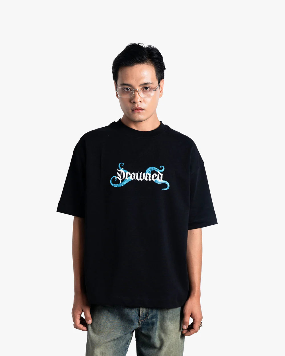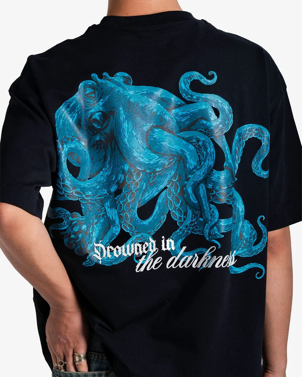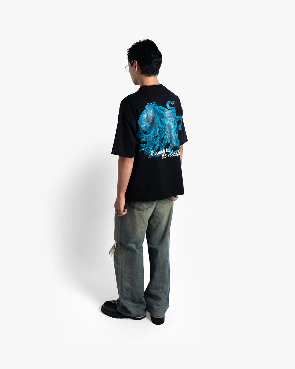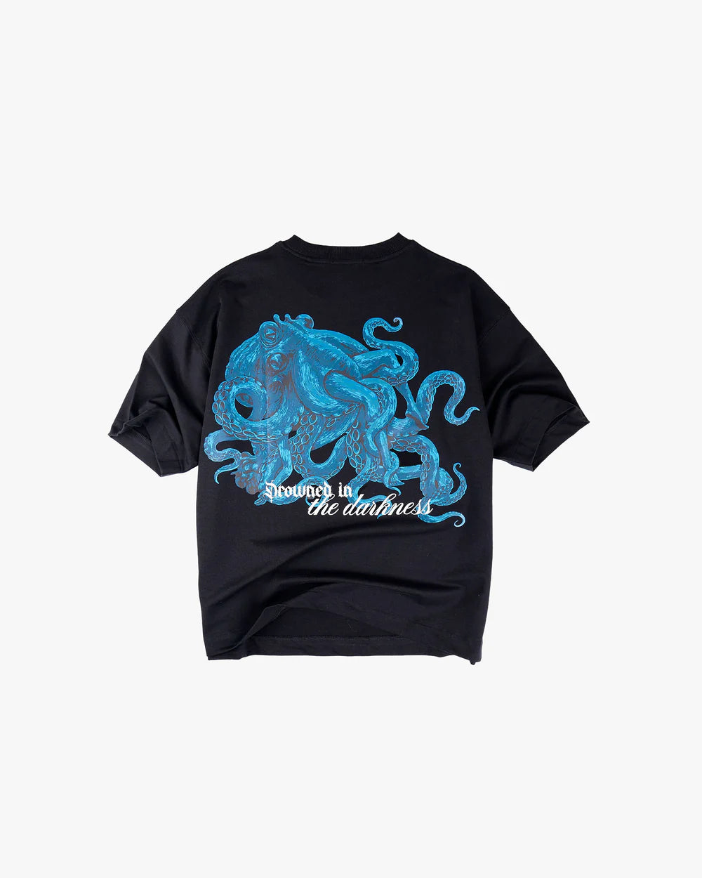Drowned in Darkness t-shirt—a premium oversized unisex graphic tee made from 250 GSM Cotton Spandex Terry Looper, treated with a double-silicone wash for an ultra-smooth, luxury feel. The jet-black canvas is brought to life by a striking oceanic octopus design, rendered in electric blue, with the bold phrasing “Drowned in the Darkness” woven into the artwork for an edgy, modern touch.