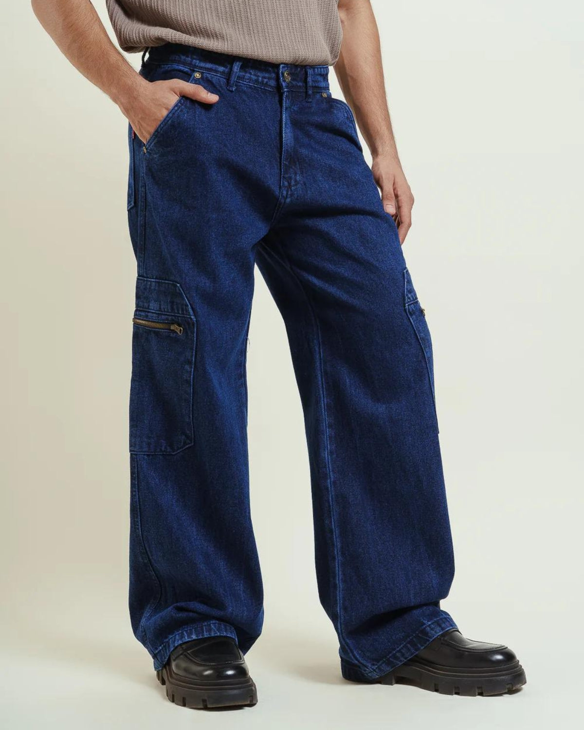 Introducing the utility baggy denim in blue. These jeans are crafted with a soft, hand-feel denim fabric and have a relaxed fit throughout the leg. They feature a heavy blue wash with hexagon patch pockets with zips to enhance the utility. The jeans are finished with branded metal trims.