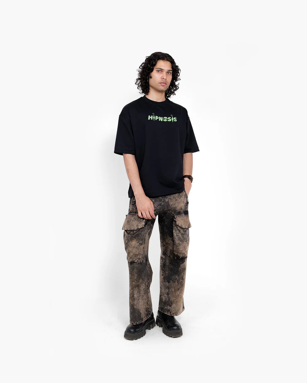 The back features a hypnotic puff print illustration of a skeletal figure crowned by multiple skulls, framed by blooming vines, piercing eyes, and cosmic symbols. This surreal design evokes themes of rebirth, consciousness, and psychedelic elegance. Finished in deep blacks with vivid pink, violet, and green tones, this tee commands attention while staying rooted in elevated streetwear style.
