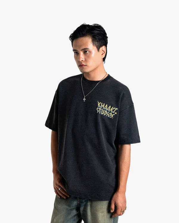 The Khaaki Studios Oversized T-Shirt is crafted from 100% Cotton Terry Looper (250 GSM), it offers a soft yet structured feel. The stone-washed finish delivers a worn-in, vintage aesthetic that resonates with both retro and Y2K-inspired styles.