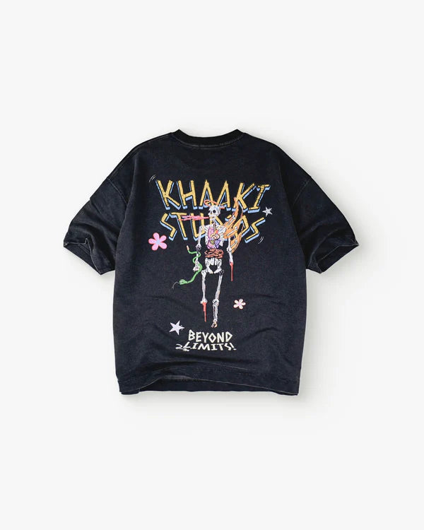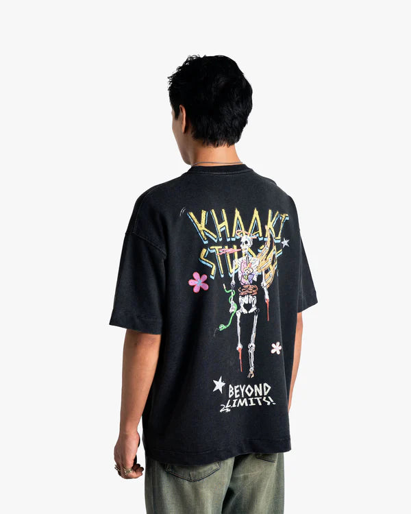Featuring striking hand-drawn graphics—a stylized skeleton with vibrant accents and edgy text. Designed with a drop-shoulder silhouette, oversized relaxed fit, and unisex appeal, the Khaaki Studios tee pairs seamlessly with baggy jeans, cargos, or street-style outerwear—elevating any modern wardrobe.