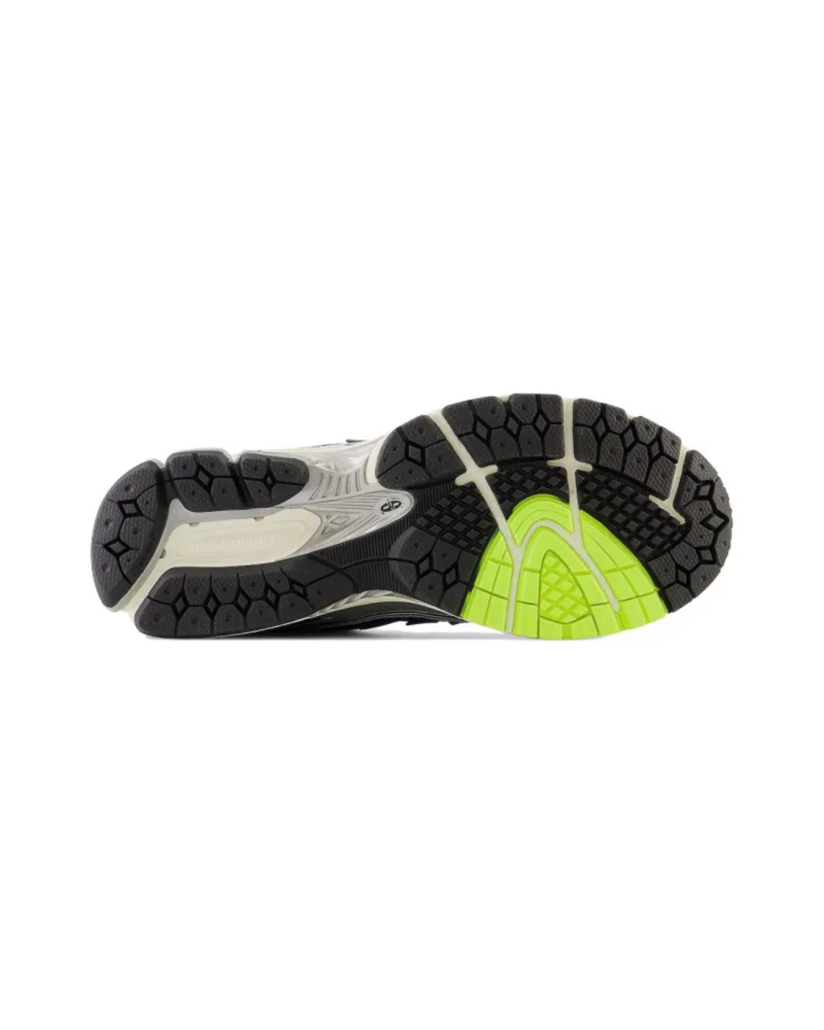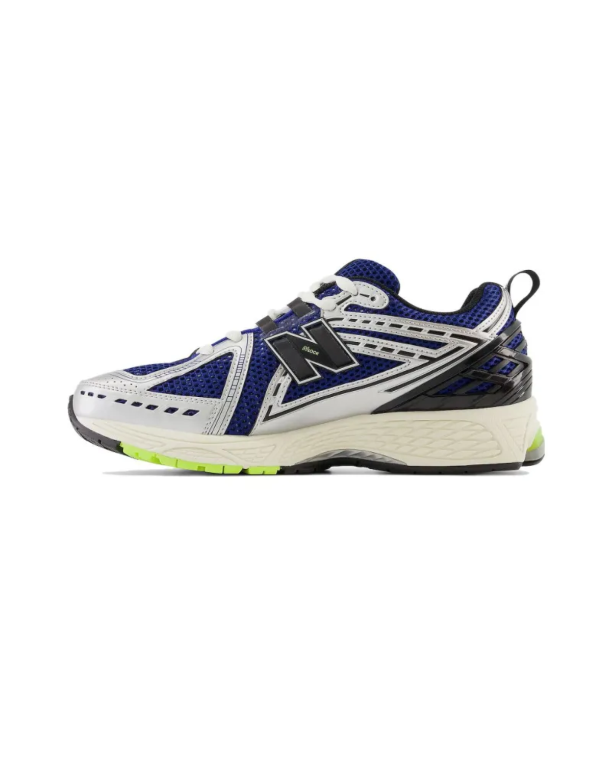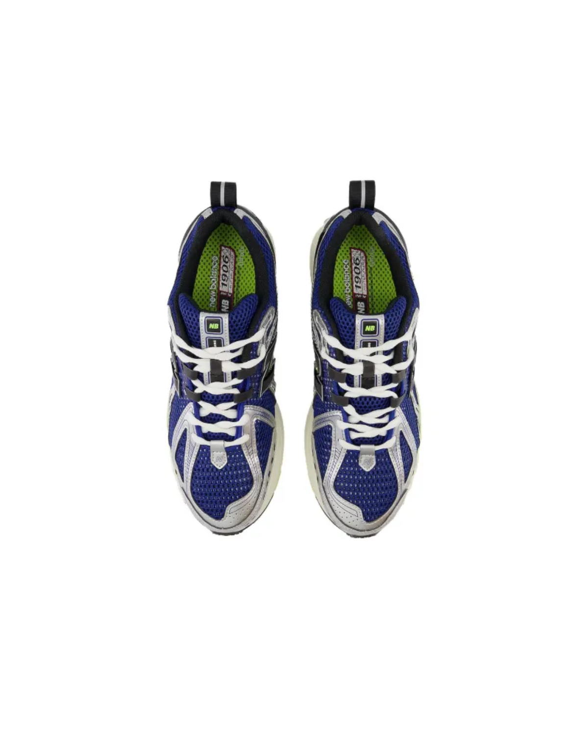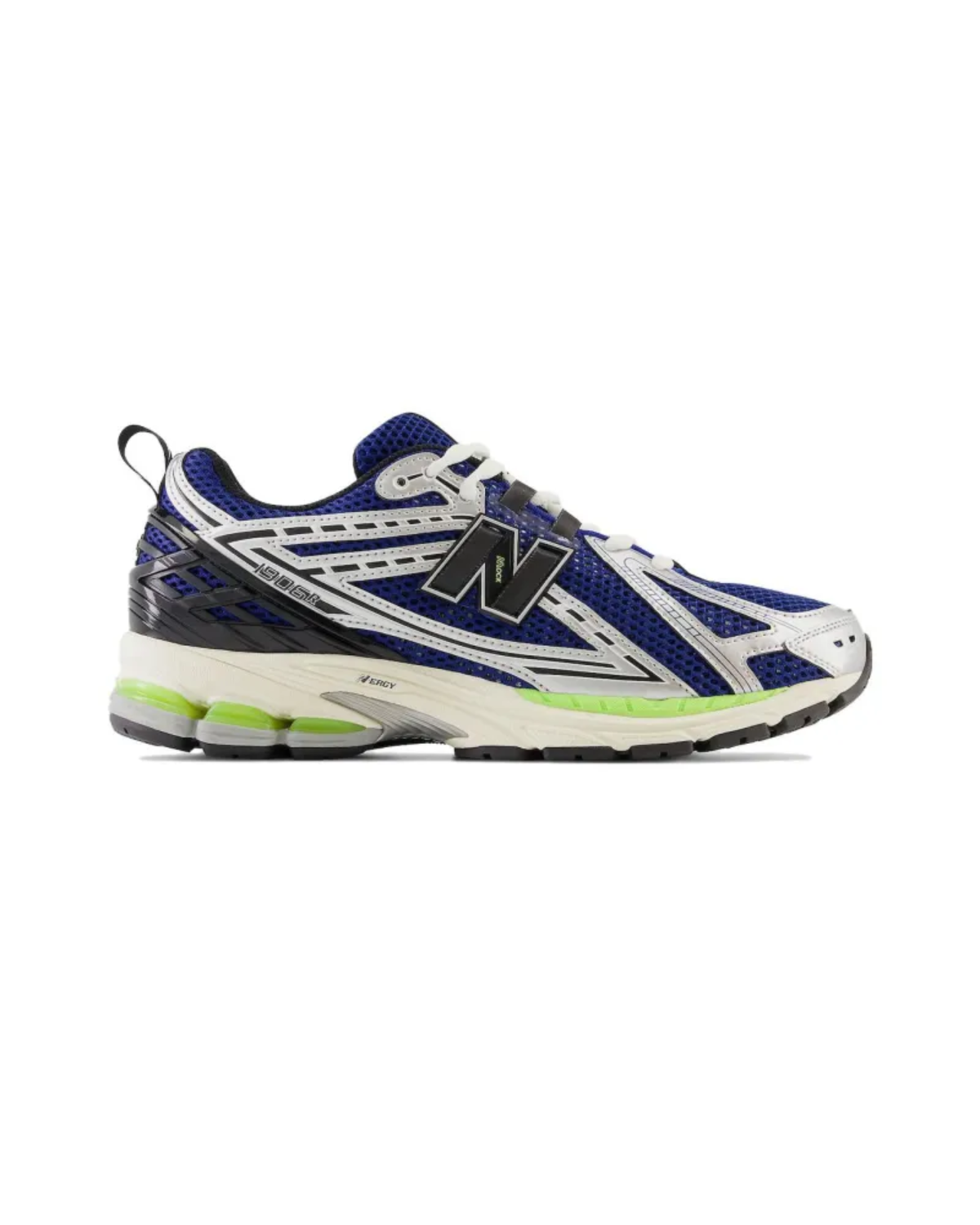 The New Balance 1906R features a royal blue open mesh upper, layered with contrasting grey and white leather overlays. To enhance the contrast, black detailing highlights the “N” logos on the side panels and heel counter. Vibrant neon green accents are applied to the midsoles, subtle branding elements, and sections of the outsole. Completing the design is an aged Sail rubber midsole, which adds a distinctive finish to the sneaker. This combination of colors and materials creates a visually striking and modern look.