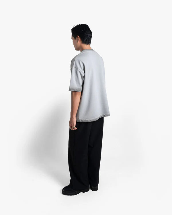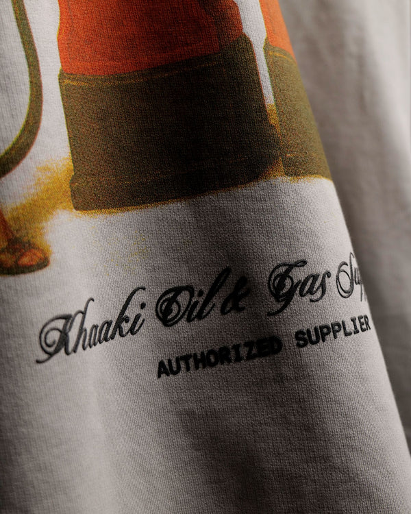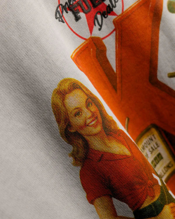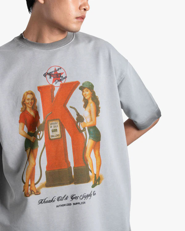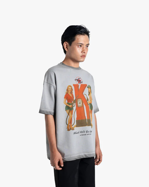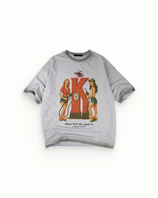 Premium Fuel - Authorised Supplier T-shirt, crafted from 100% Cotton Terry Looper in a sturdy 250 GSM. This faded washed grey oversized t-shirt features a bold retro graphic print of a vintage pump station, symbolizing energy and drive. The cold pigment washing process delivers a unique, worn-in texture that enhances its vintage and nostalgic vibe, making every piece one-of-a-kind.