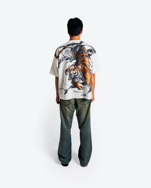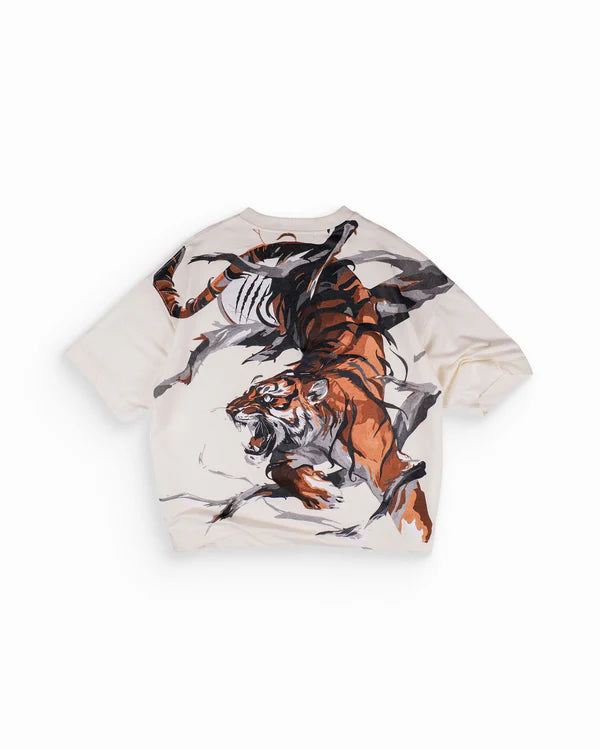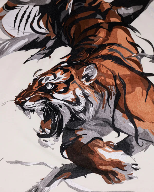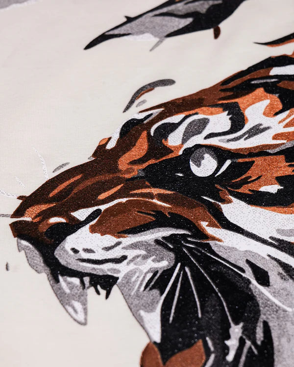 Ruthless—a premium, Made from ultra-smooth Cotton Spandex Terry Looper, this is a high-quality oversized t-shirt that’s both durable and supremely soft. The heavyweight 250 GSM cotton t-shirt in off-white colour showcases a striking tiger graphic back print that captures movement and strength with painterly flair.