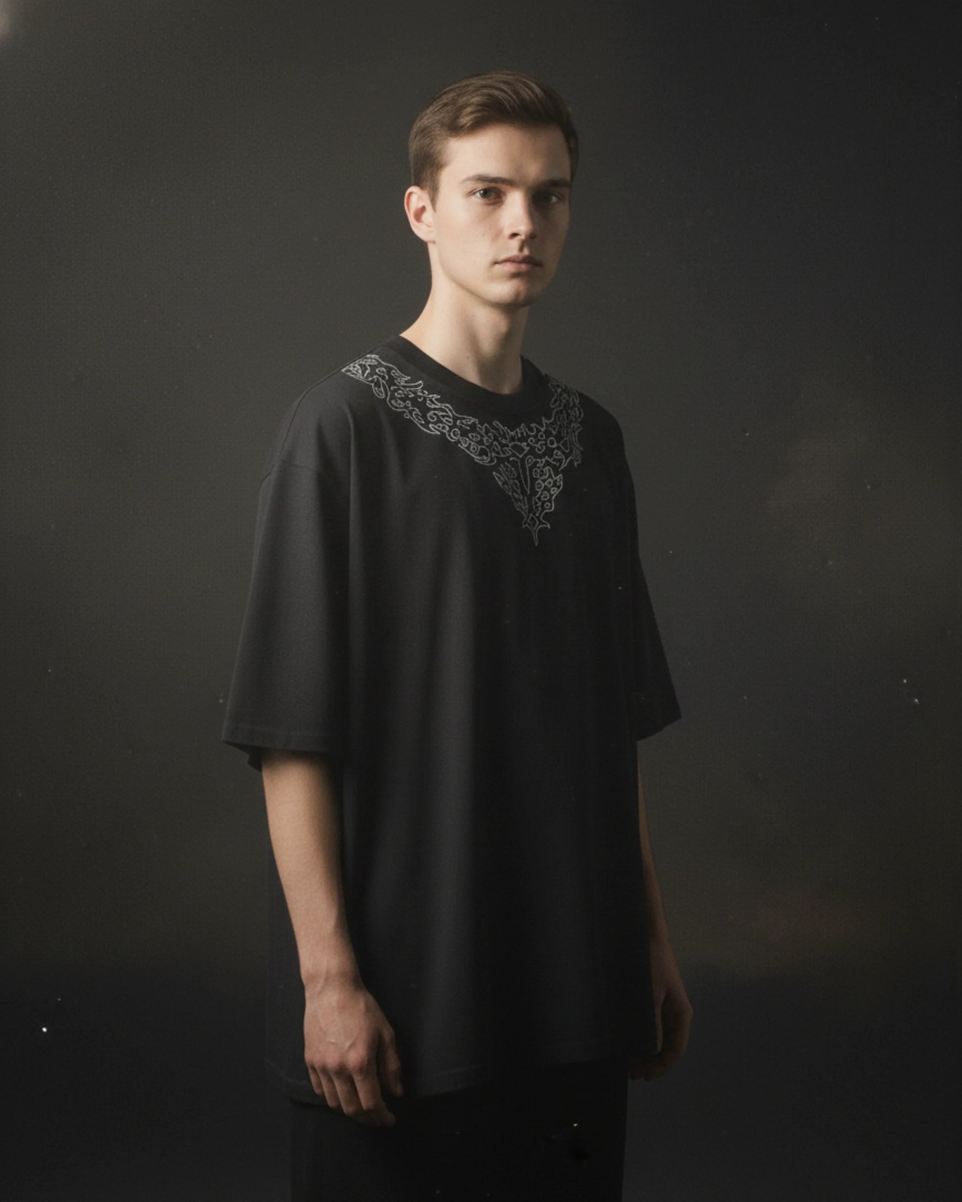 The Shadow Crown Hand-Embroidered Oversized T-Shirt is where minimalism meets gothic streetwear. Designed for those who see fashion as armor, this black tee transforms artisan embroidery into a bold statement of power and individuality.