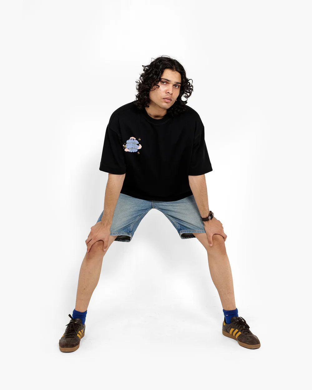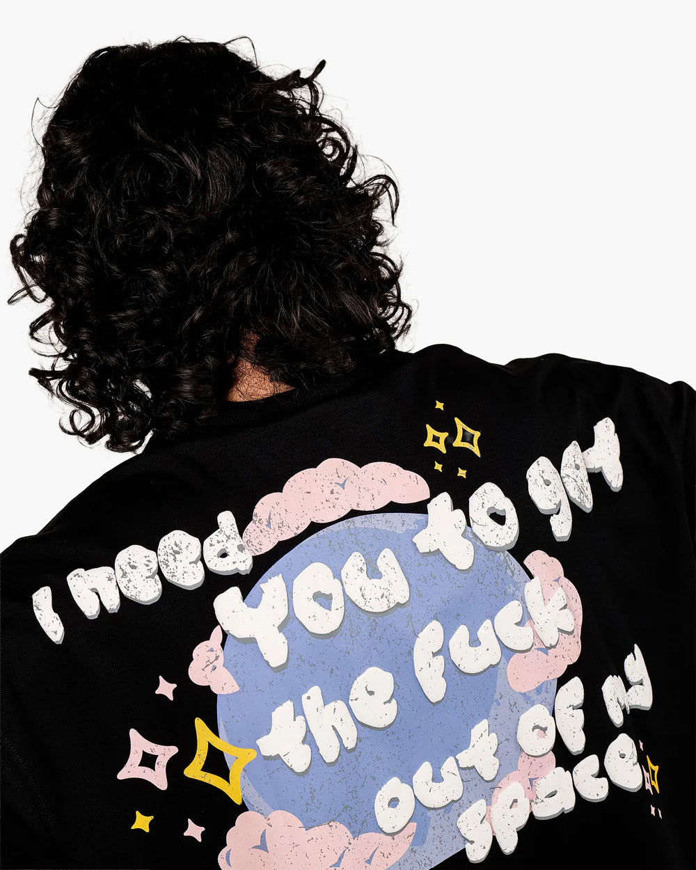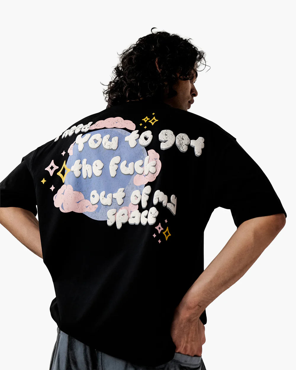 A premium oversized unisex t-shirt in jet black, crafted from heavyweight 260 GSM cotton spandex terry looper for unmatched softness and structure. Featuring a bold, multicolour puff print that reads “I need you to get the f*ck out of my space,” this tee blends humour, rebellion, and galactic vibes.