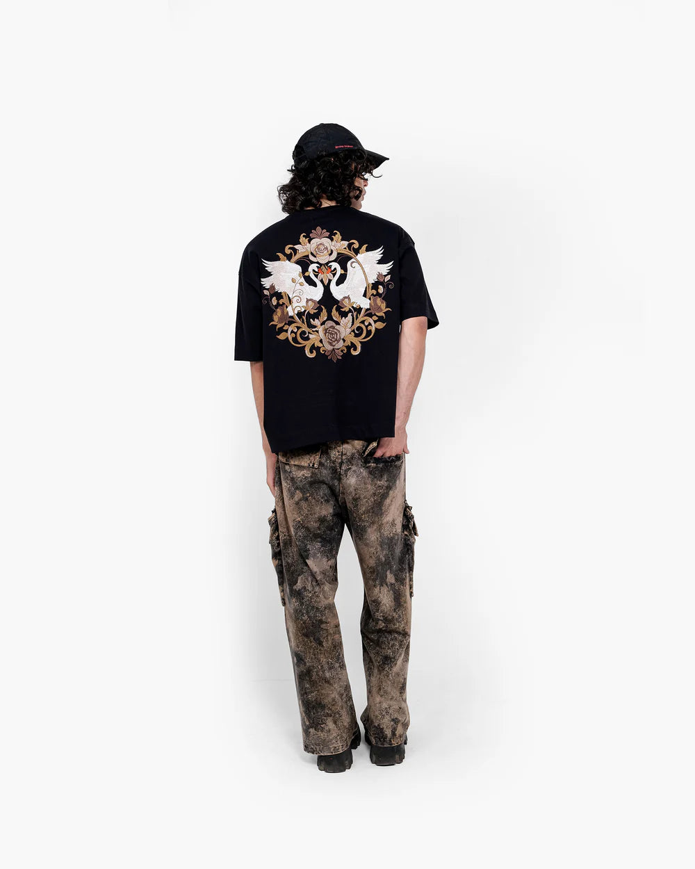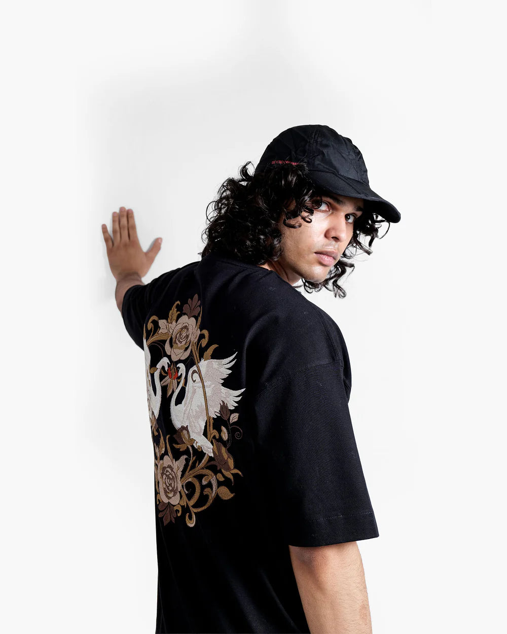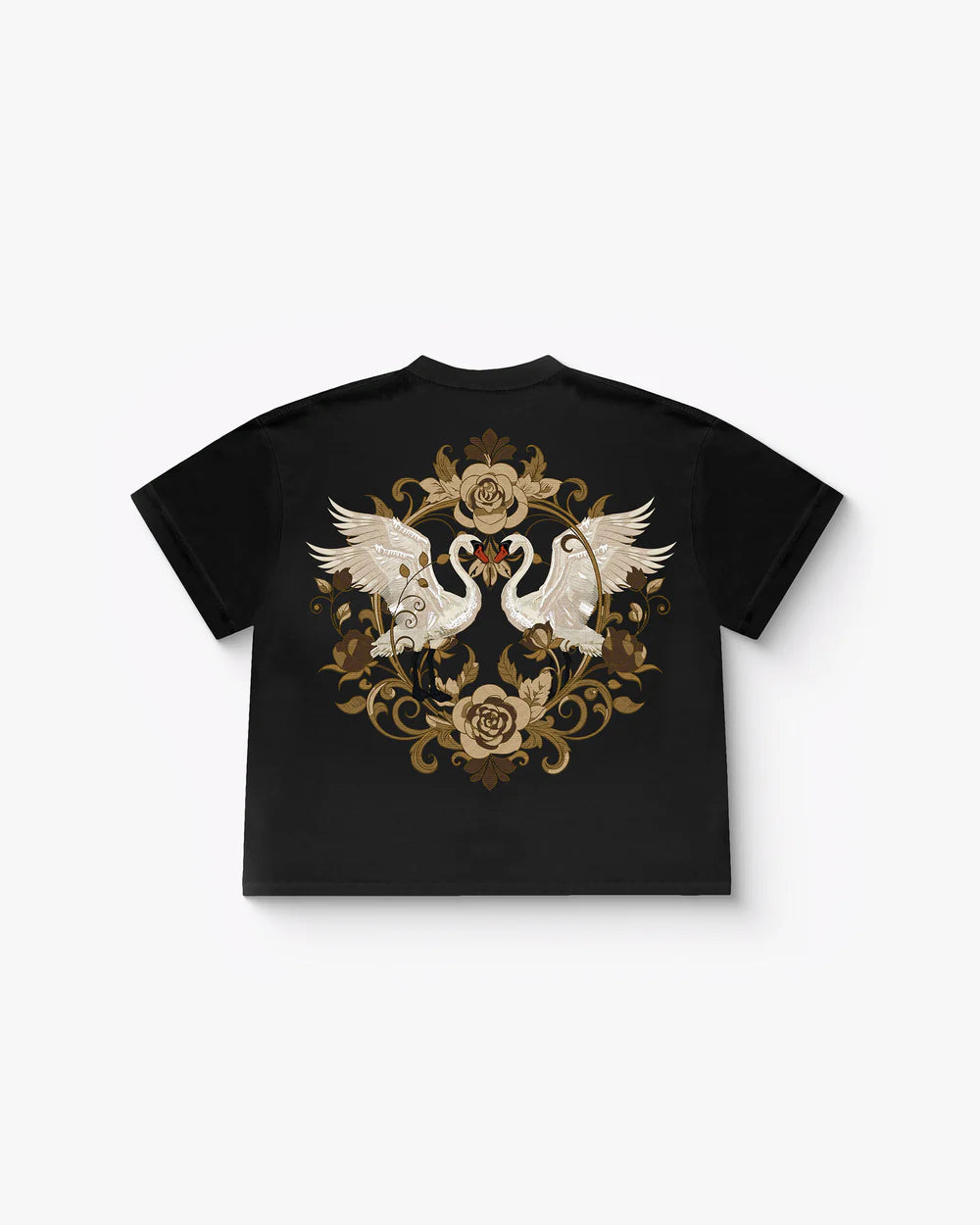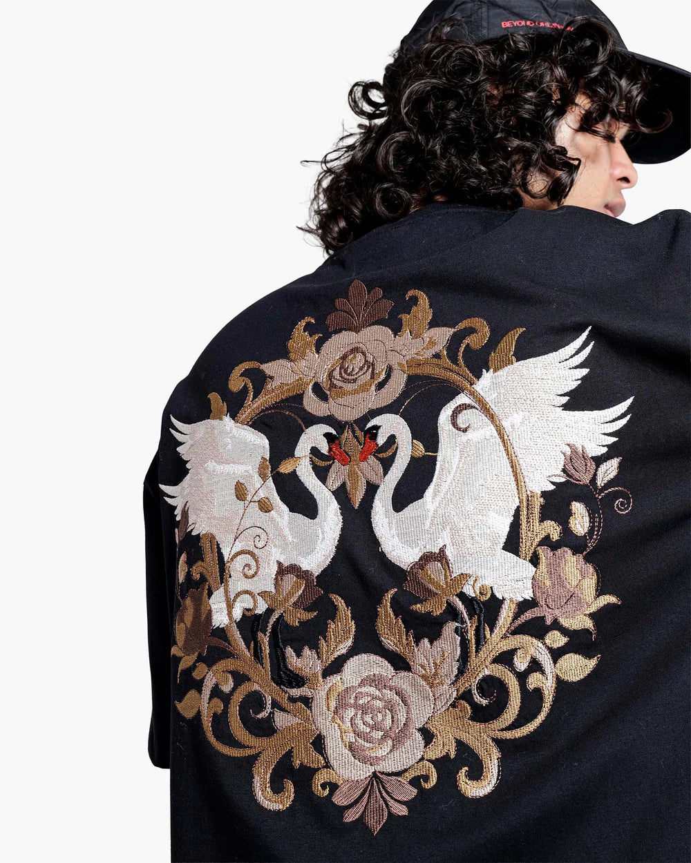 Crafted from heavyweight 100% mercerized cotton and finished with a luxurious double silicone wash, this piece showcases nearly 3 lakh embroidery stitches in earthy tones, weaving a regal scene of swans, roses, and vintage baroque flourishes. The detailed embroidery on the chest adds a refined contrast, perfectly tying in with the majestic full-back artwork.