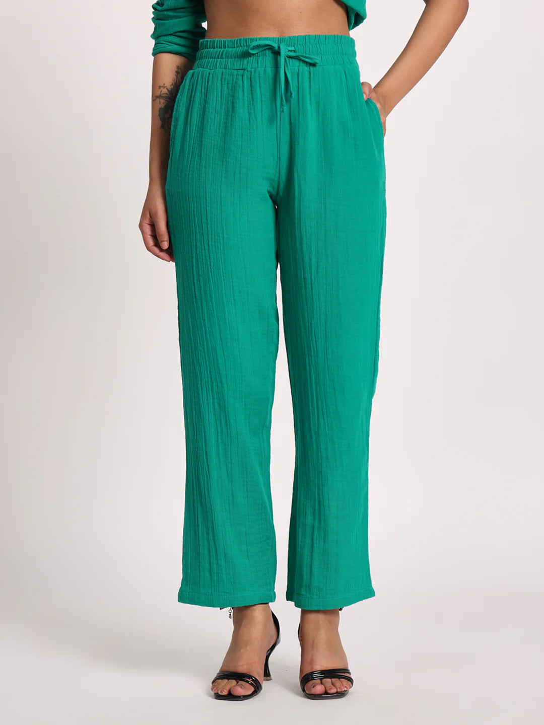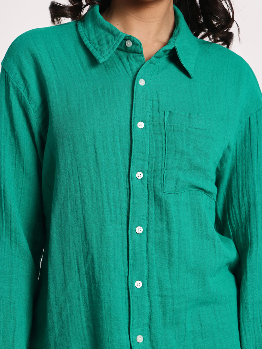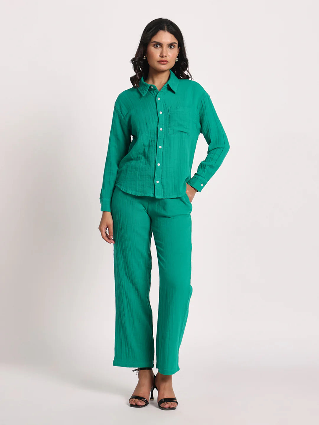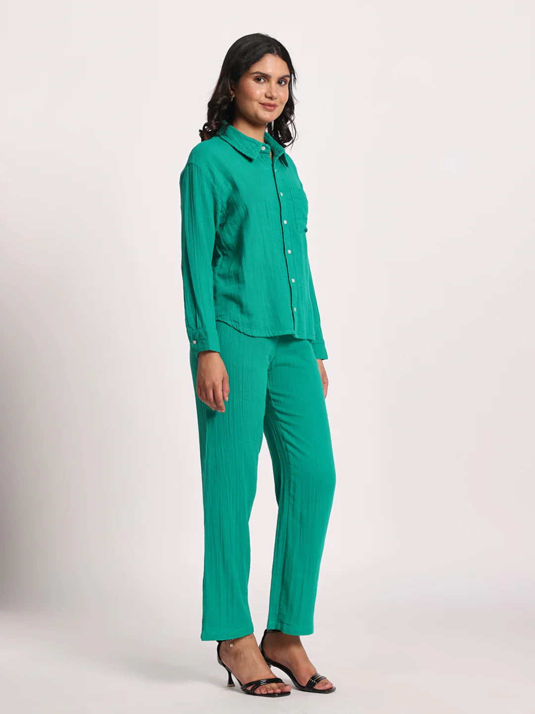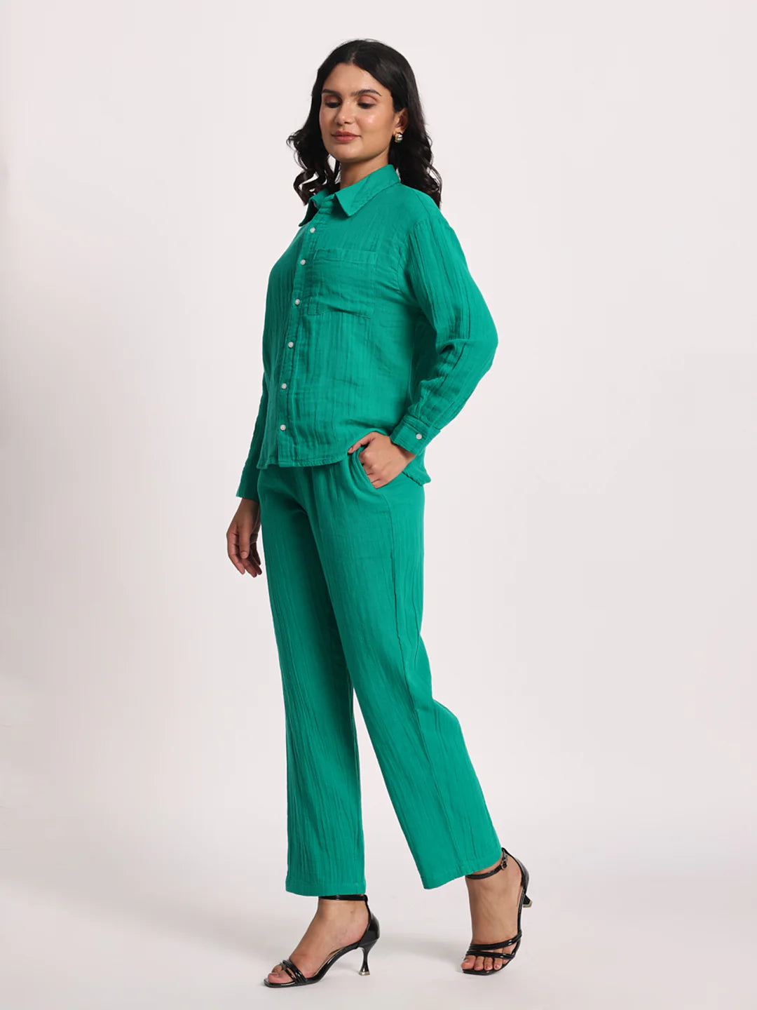 Inject a pop of color into your wardrobe with our "Vibrant Teal" Co-ord Set, a stylish and comfortable ensemble perfect for various occasions. This set features a classic long-sleeve button-down shirt with a single chest pocket, offering a relaxed yet polished look. Paired with coordinating straight-leg trousers, this outfit creates a chic and harmonious silhouette. Crafted in an eye-catching teal hue with a subtle textured finish, this co-ord set is ideal for casual outings, resort wear, or adding a cheerful touch to your everyday style. Its breathable fabric and comfortable fit make it a go-to for effortless elegance.