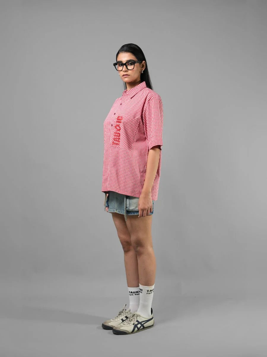 A shirt that speaks louder than words. Featuring a bold “TOO MUCH” graphic on the back and the brand name TAUXXIC on the front, this red gingham check shirt brings a playful twist to a classic pattern. Relaxed in fit and easy to style, it’s designed to stand out whether layered or worn solo.