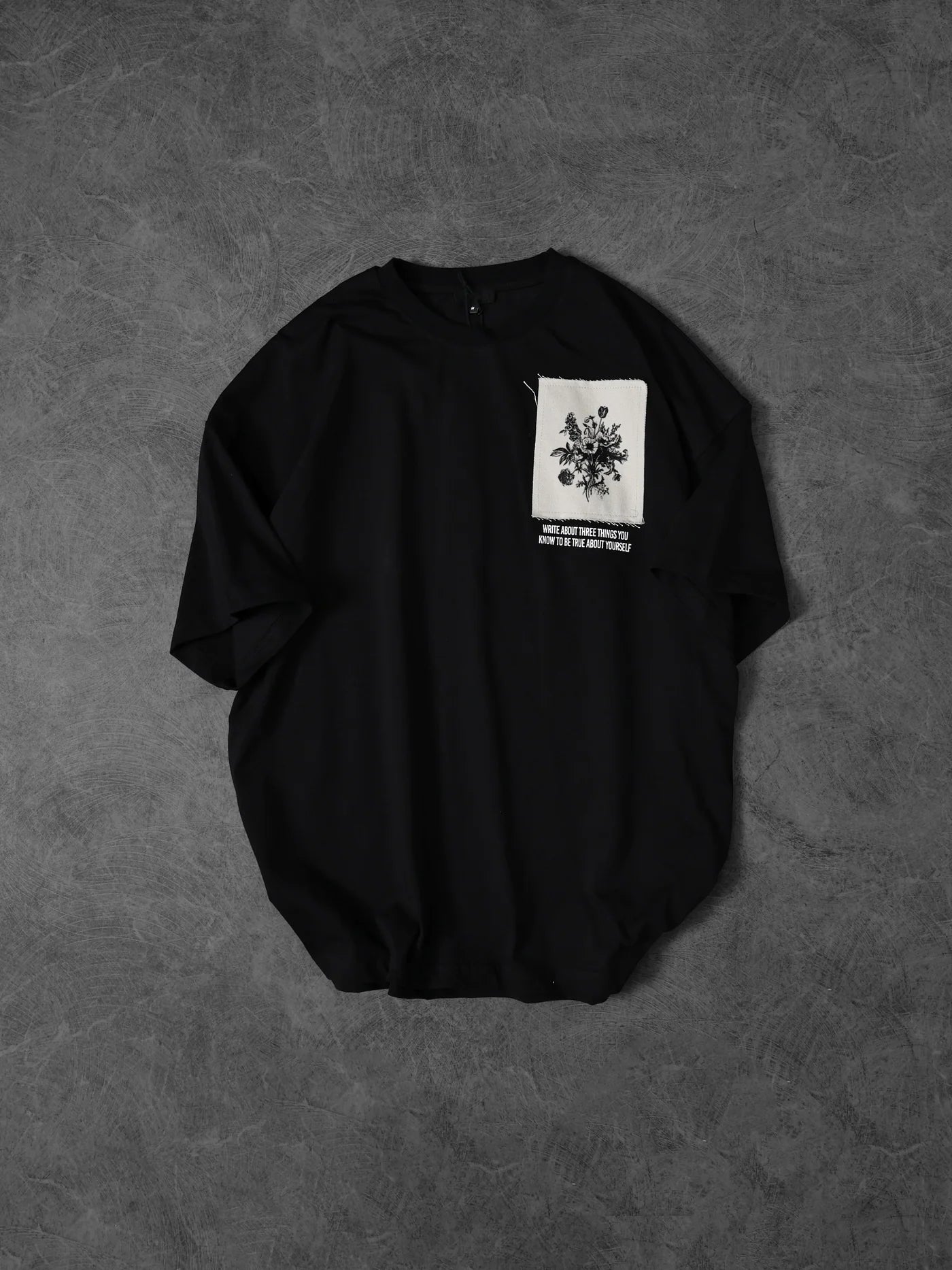 Memory, identity, and statement fuse in the True About You Tee. Framed by a vivid paisley print and centered with a delicate floral sketch, the design evokes introspection layered with street-ready impact. At the bottom, bold typography prompts a moment of self-awareness: “Write about three things you know to be true about yourself.”
